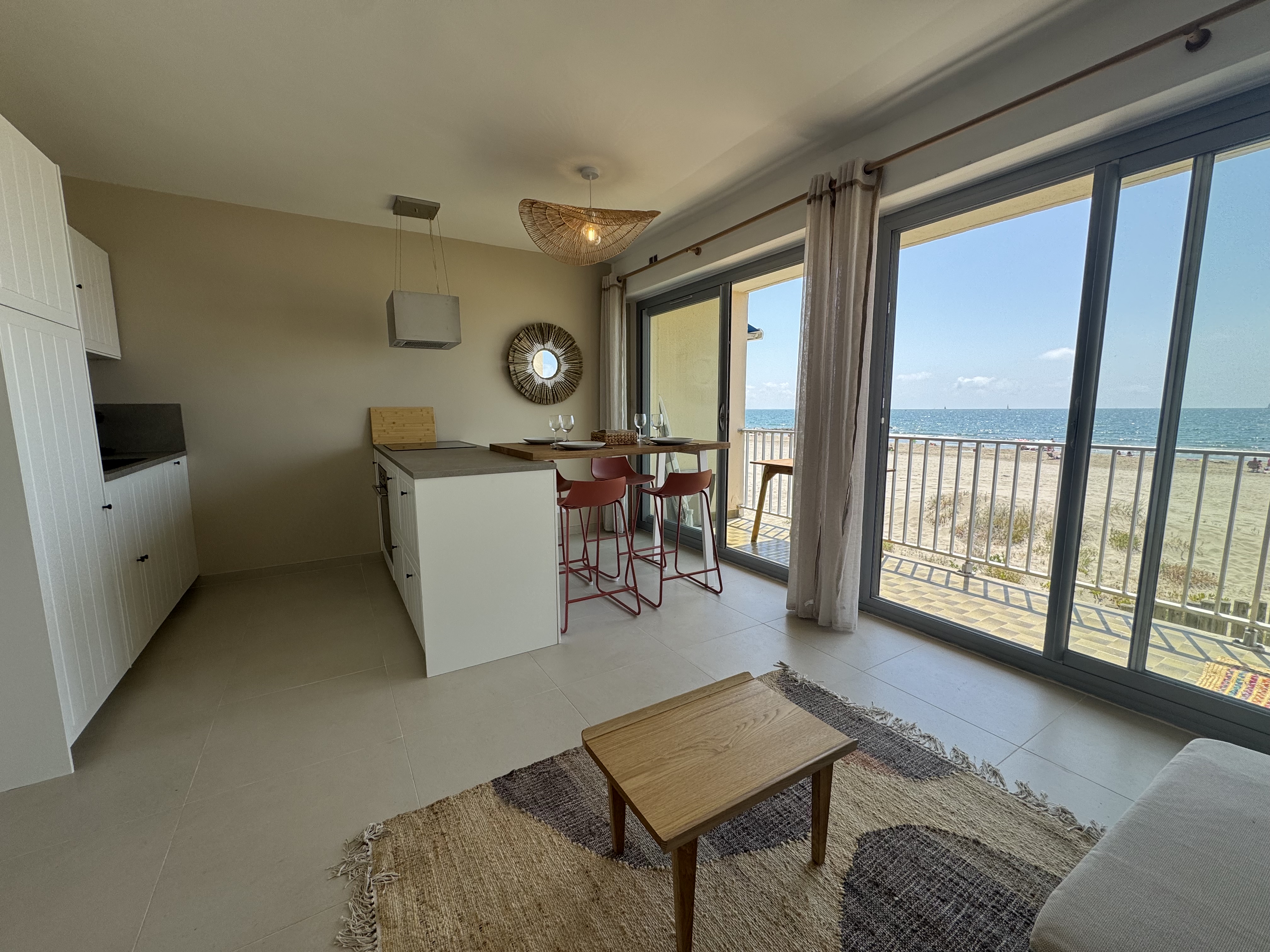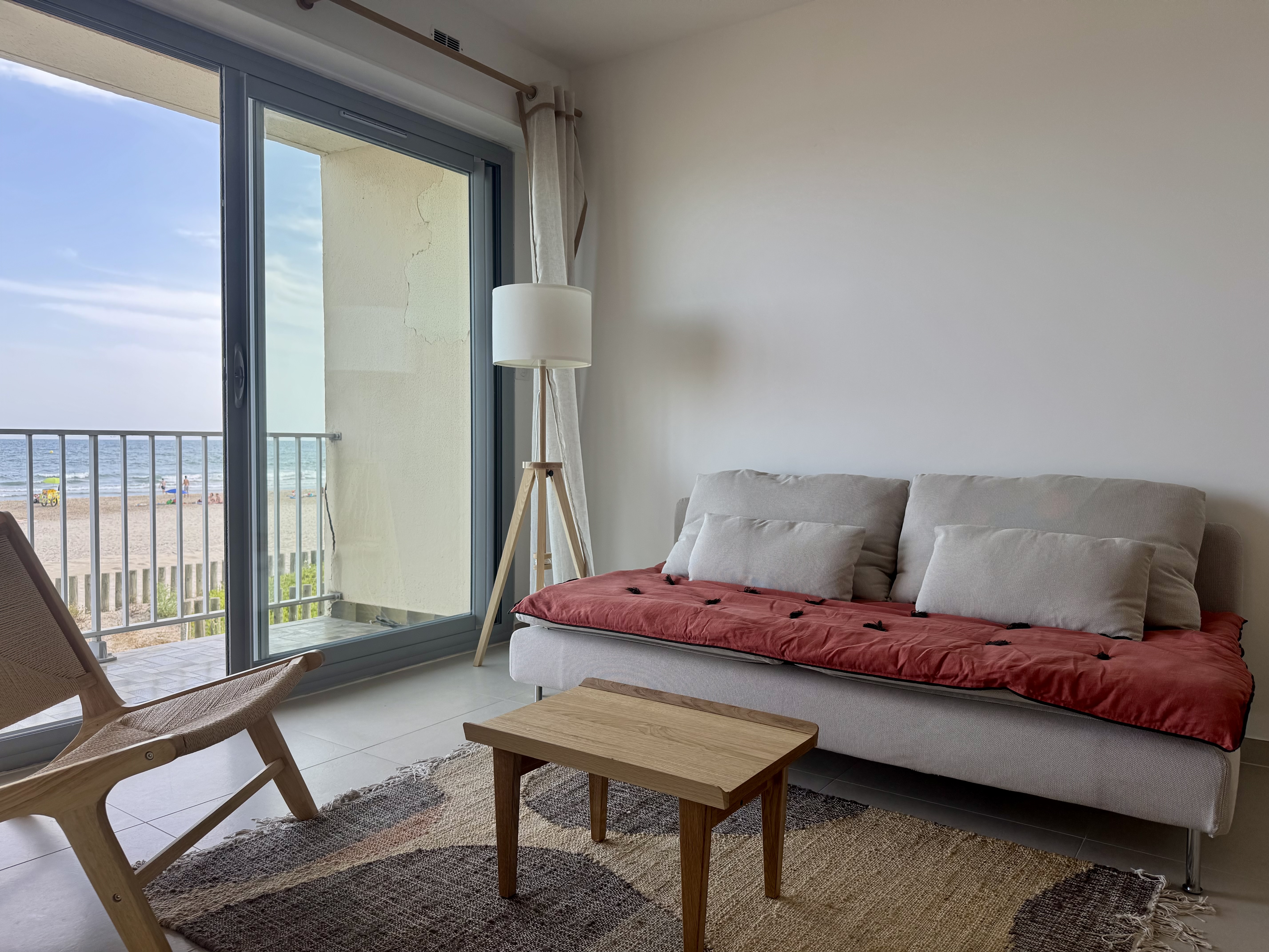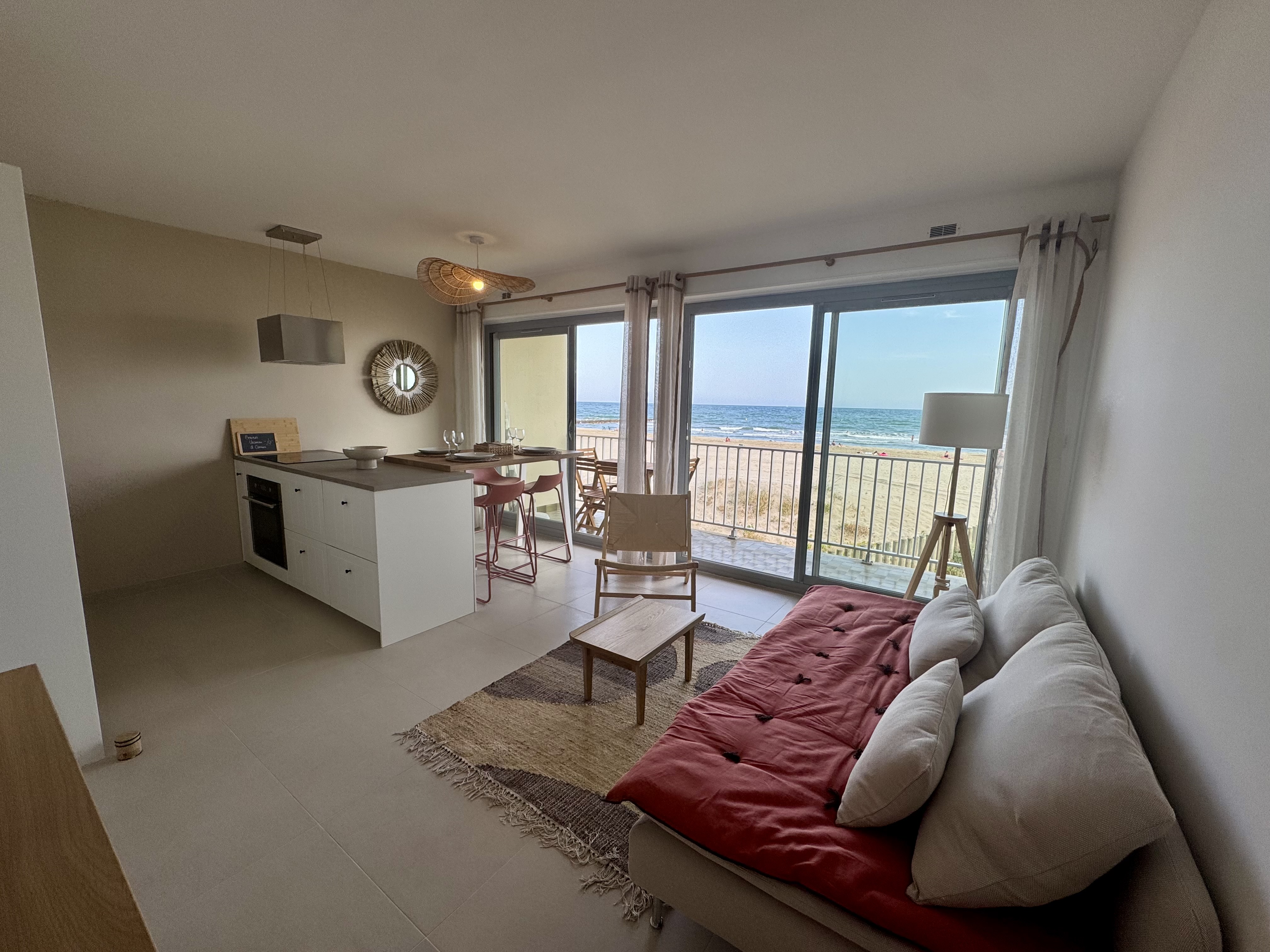 F2 sur la plage, en 1ère ligne. 3 couchages. 32 m2 habitables avec grande terrasse plein sud est avec vue incroyable sur la mer,(avec table de jardin), séjour de 20 m2 avec TV connectée, banquette lit en 90×190 (avec un surmatelas pour le 3eme couchage), 1 cuisine ouverte équipée (machine à laver la vaisselle, four, four micro ondes, machine à café Tassimo, lave linge), 1 chambre avec 1 lit en 150 x 200, salle de bain italienne, WC séparé. Place de parking dans parking collectif privé (hauteur max 1,90m). Internet par la fibre.