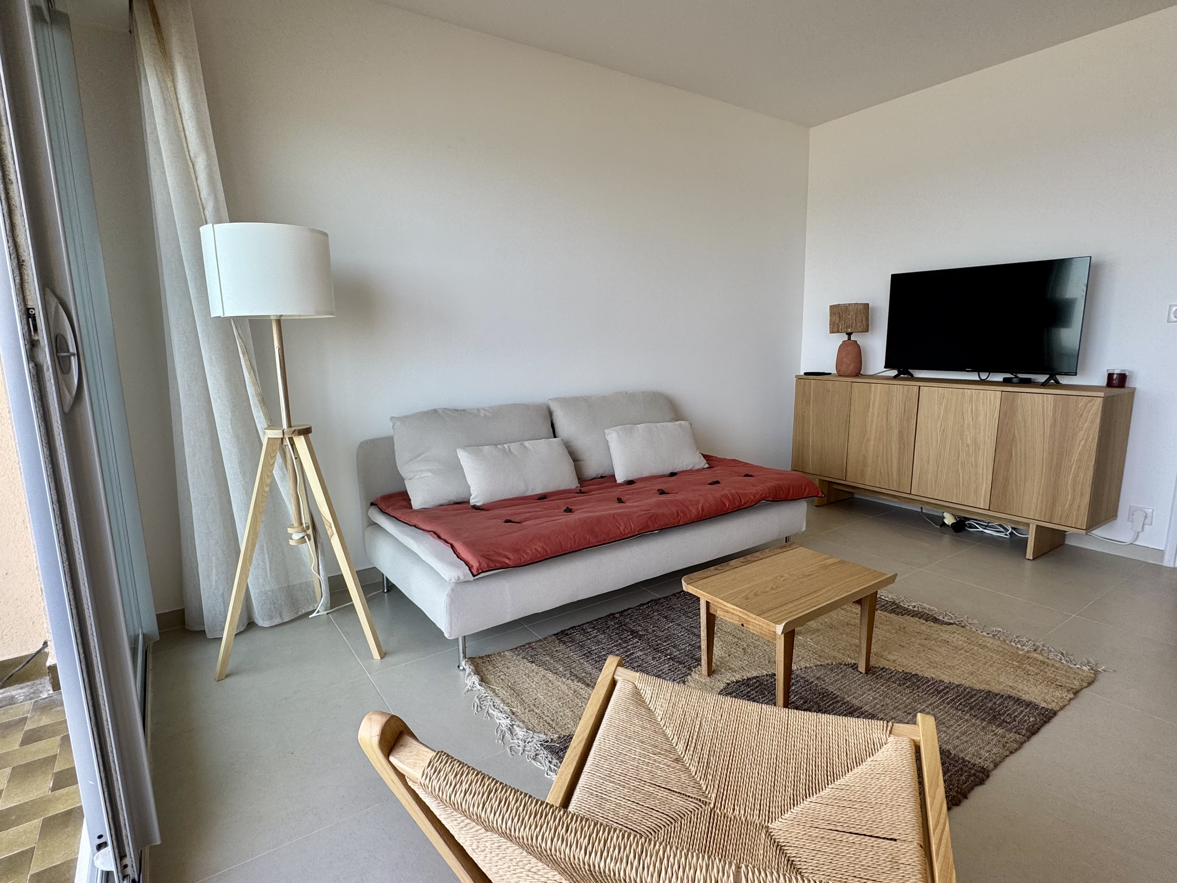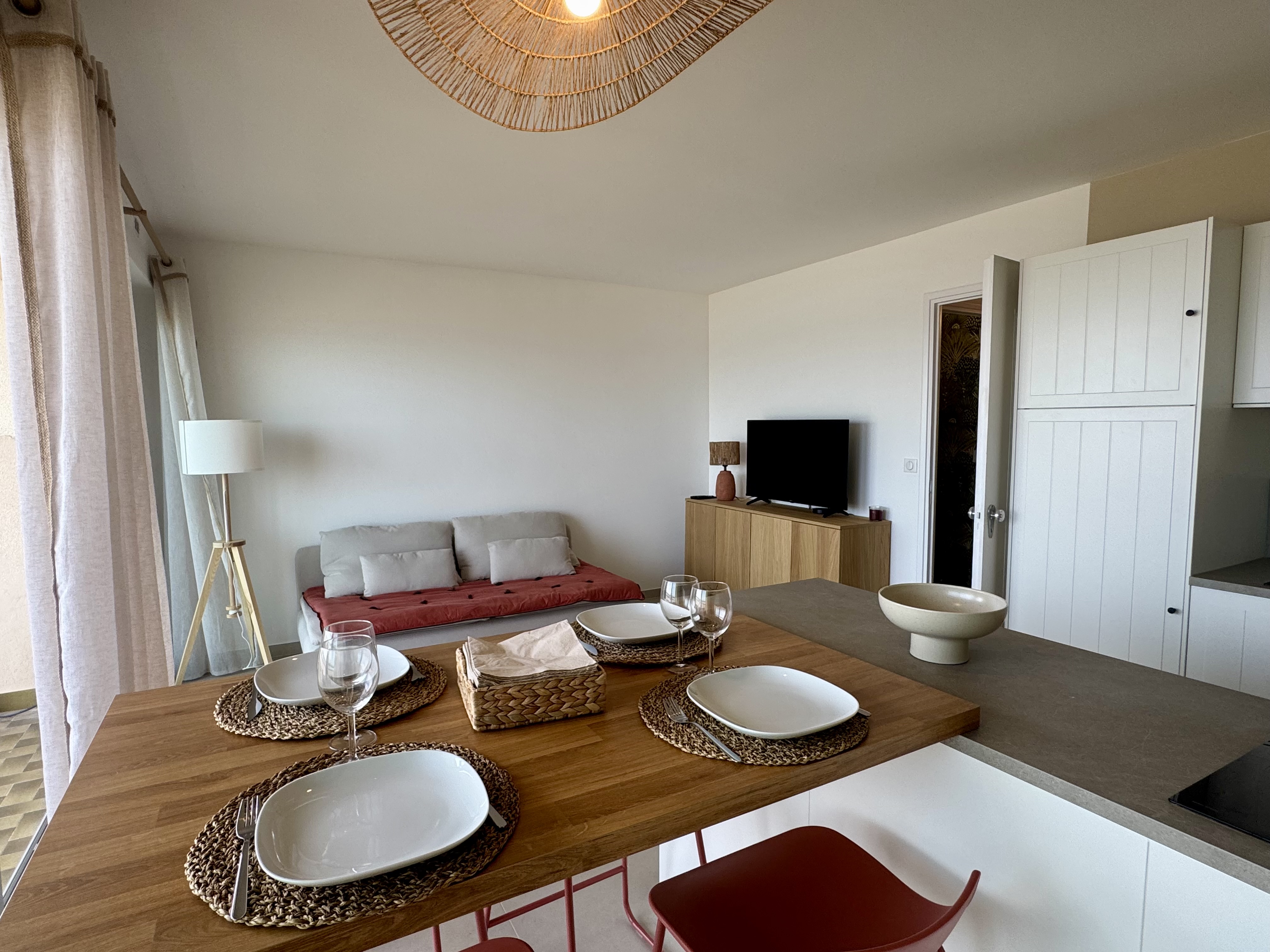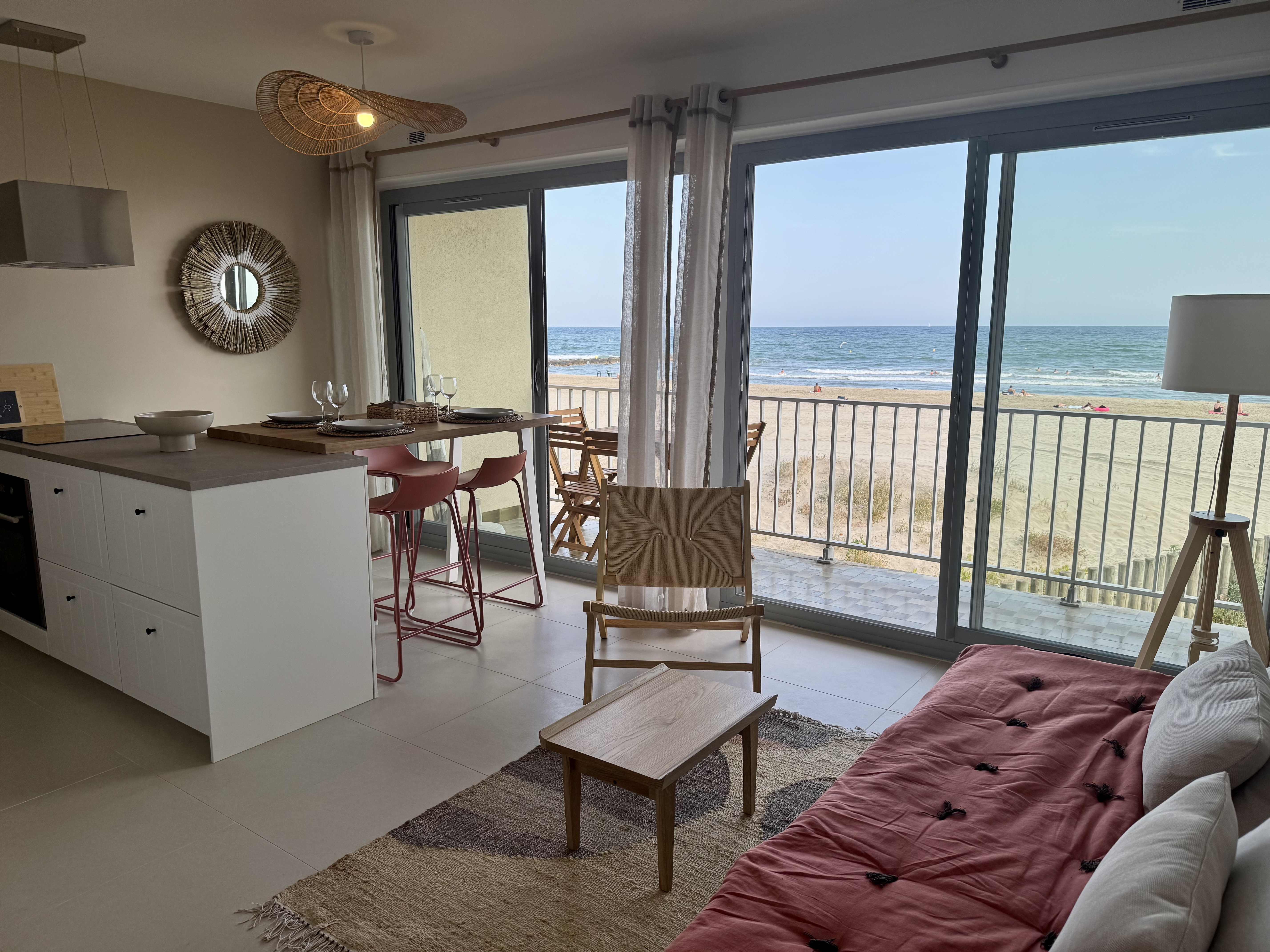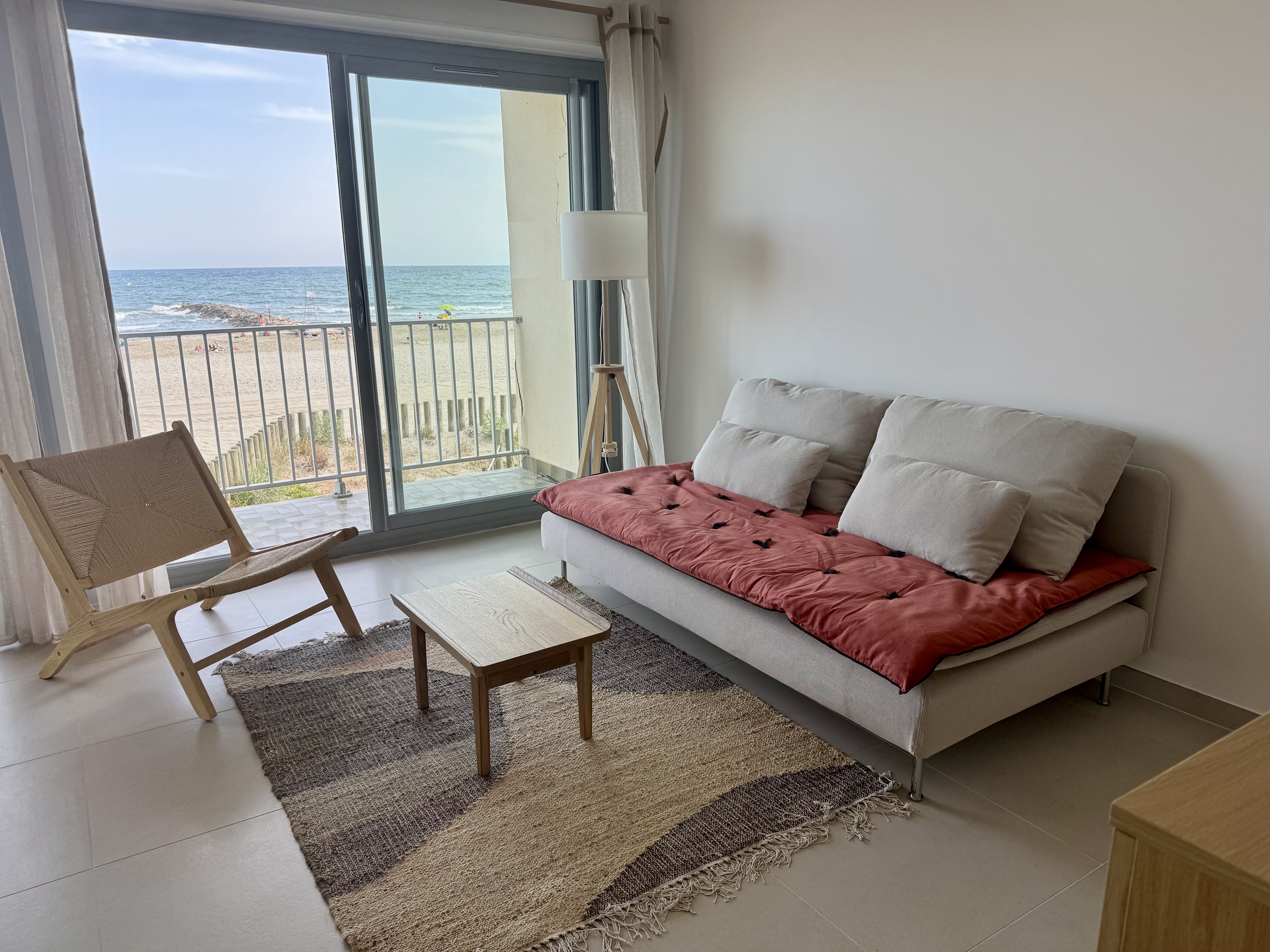 F2 sur la plage, en 1ère ligne. 3 couchages. 32 m2 habitables avec grande terrasse plein sud est avec vue incroyable sur la mer,(avec table de jardin), séjour de 20 m2 avec TV connectée, banquette lit en 90×190 (avec un surmatelas pour le 3eme couchage), 1 cuisine ouverte équipée (machine à laver la vaisselle, four, four micro ondes, machine à café Tassimo, lave linge), 1 chambre avec 1 lit en 150 x 200, salle de bain italienne, WC séparé. Place de parking dans parking collectif privé (hauteur max 1,90m). Internet par la fibre.