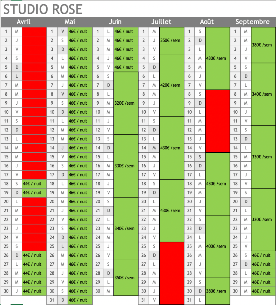 Location à la semaine (à partir de 200€ à 450€) ou au mois (uniquement entre octobre et mars, à partir de 550€).